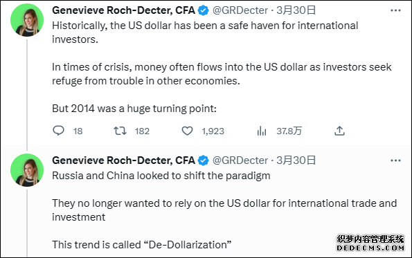 3月30日,推特账号介绍为前资金经济、为彭博社等媒体供稿的财经类撰稿人吉纳维芙·罗克-迪克特(Genevieve Roch-Decter)发布一系列推文称:“美元正在失去其储备货币的地位,这是你应该知道的。”随后,她继续发文介绍相关信息。